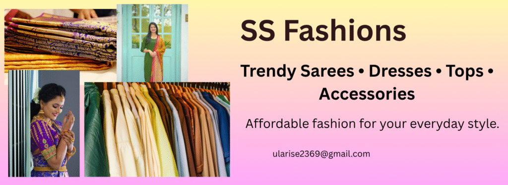 “Welcome to SS Fashions — Your One-Stop Shop for Stylish Dresses, Sarees & Accessories!” Shop now "Shop by Category" “SS Fashions is your trusted shop for trendy dresses, beautiful Sarees, and daily wear essentials. Every piece is handpicked with love to make you look confident and elegant every day.” Know more 📍 Anand Nagar Colony, Pin 502032📞 6300723695ularise@gmail.com