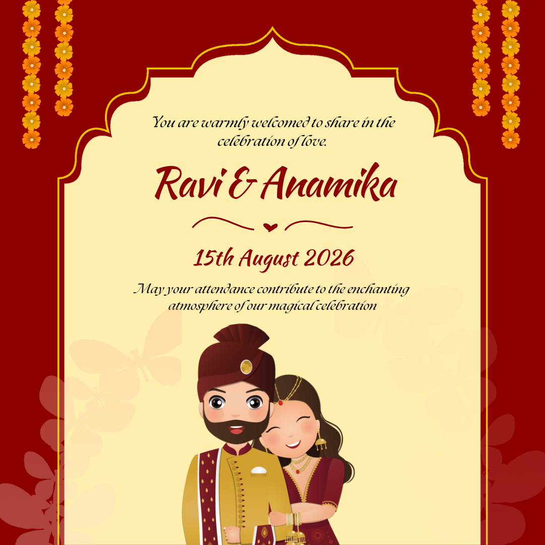 Make your special day unforgettable with our customized digital wedding invitation cards. Each design is beautifully created with elegant colors, patterns, and layouts — perfect for both traditional and modern weddings.