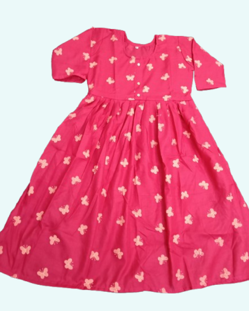 Add a cute and simple charm to your daily look with this pink frock-style top featuring small cream butterfly prints. The round neckline and 3/4 sleeves give it a soft, casual look — perfect for everyday comfort and easy styling.