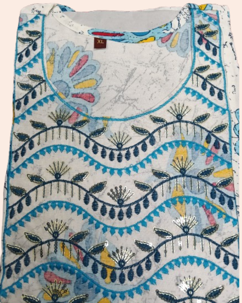 Bring effortless elegance to your everyday style with this stunning white cotton top featuring blue big floral prints and delicate thread embroidery work around the neckline. Designed for both comfort and charm, this top is made from soft, breathable cotton fabric — perfect for all-day wear.